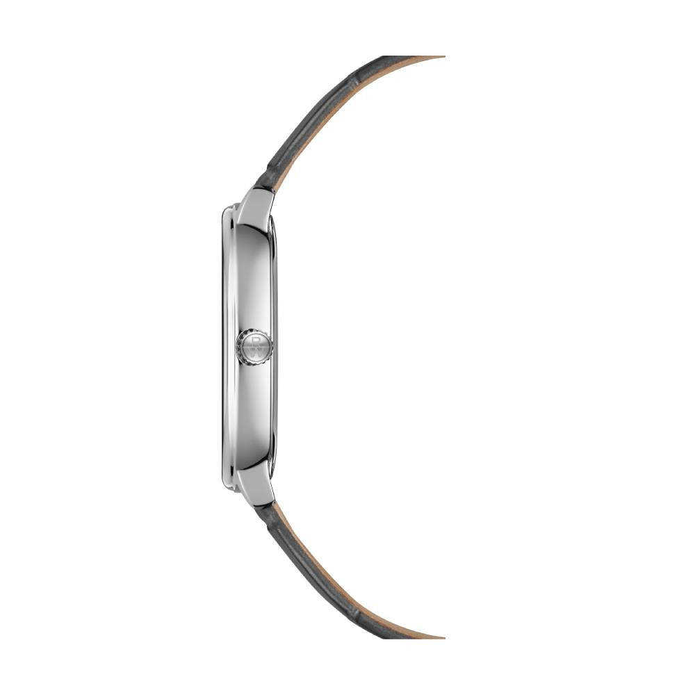 Моделът впечатлява с правоъгълен корпус от благородна стомана, сребрист циферблат с фини индекси и сива каишка от висококачествена телешка кожа.