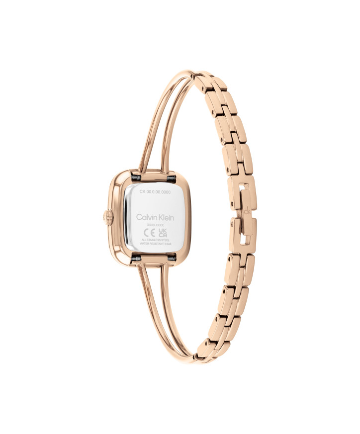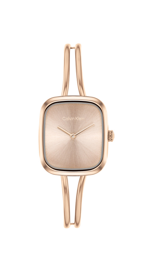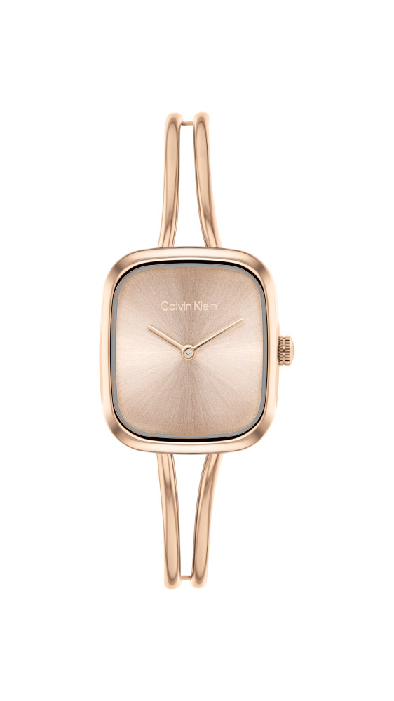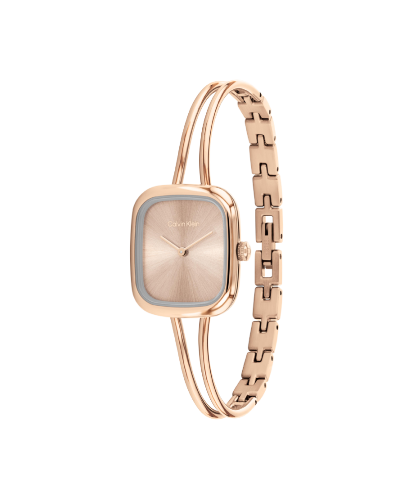 Часовник Calvin Klein 25100133 впечатлява с фин силует, модерна елегантност и характерното за марката минималистично усещане. Компактният корпус с диаметър 20.8 mm и дебелина 6.5 mm е изработен от благородна стомана с розово PVD покритие, което придава луксозен и стилен вид. Розово-златният циферблат създава хармонична визия, а изчистеният дизайн подчертава женствения характер на модела. Минералното стъкло осигурява защита, а тънкият кварцов механизъм Quartz Basic Slim гарантира прецизна работа. С водоустойчивост 3 ATM часовникът е отличен избор за ежедневна елегантност и специални поводи.