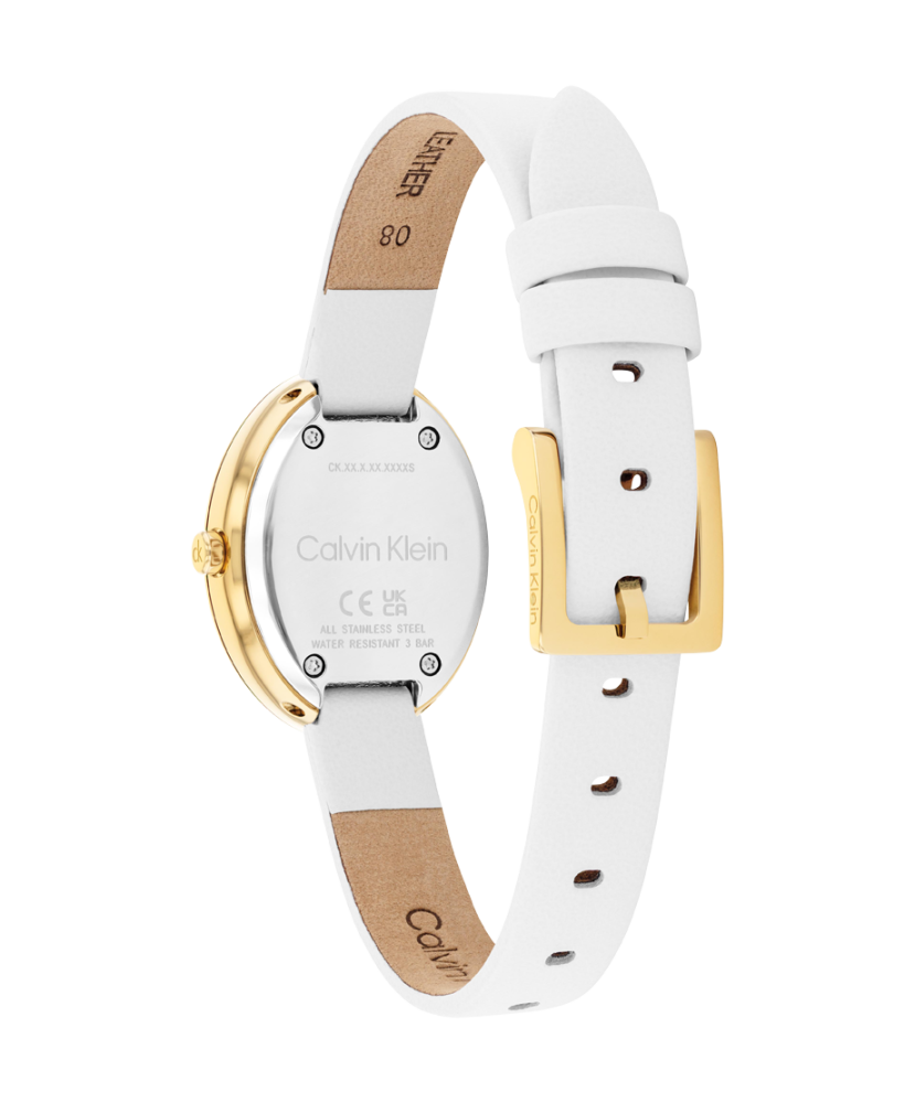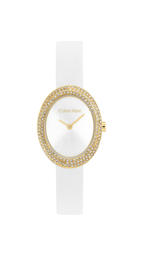 Часовник Calvin Klein 25100146 от колекцията Twisted Bezel впечатлява с бляскава елегантност, подчертан женствен силует и модерен дизайн. Овалният корпус от благородна стомана с жълто PVD покритие и инкрустирани цирконии създава изискан луксозен акцент, а компактните размери от 24 mm го правят деликатен и удобен за ежедневно носене. Сребристият циферблат излъчва фин блясък, докато бялата кожена каишка добавя свежест и стил. Минералното стъкло осигурява защита, а кварцовият механизъм гарантира надеждна точност. С водоустойчивост 3 ATM моделът е идеален за ежедневна елегантност.