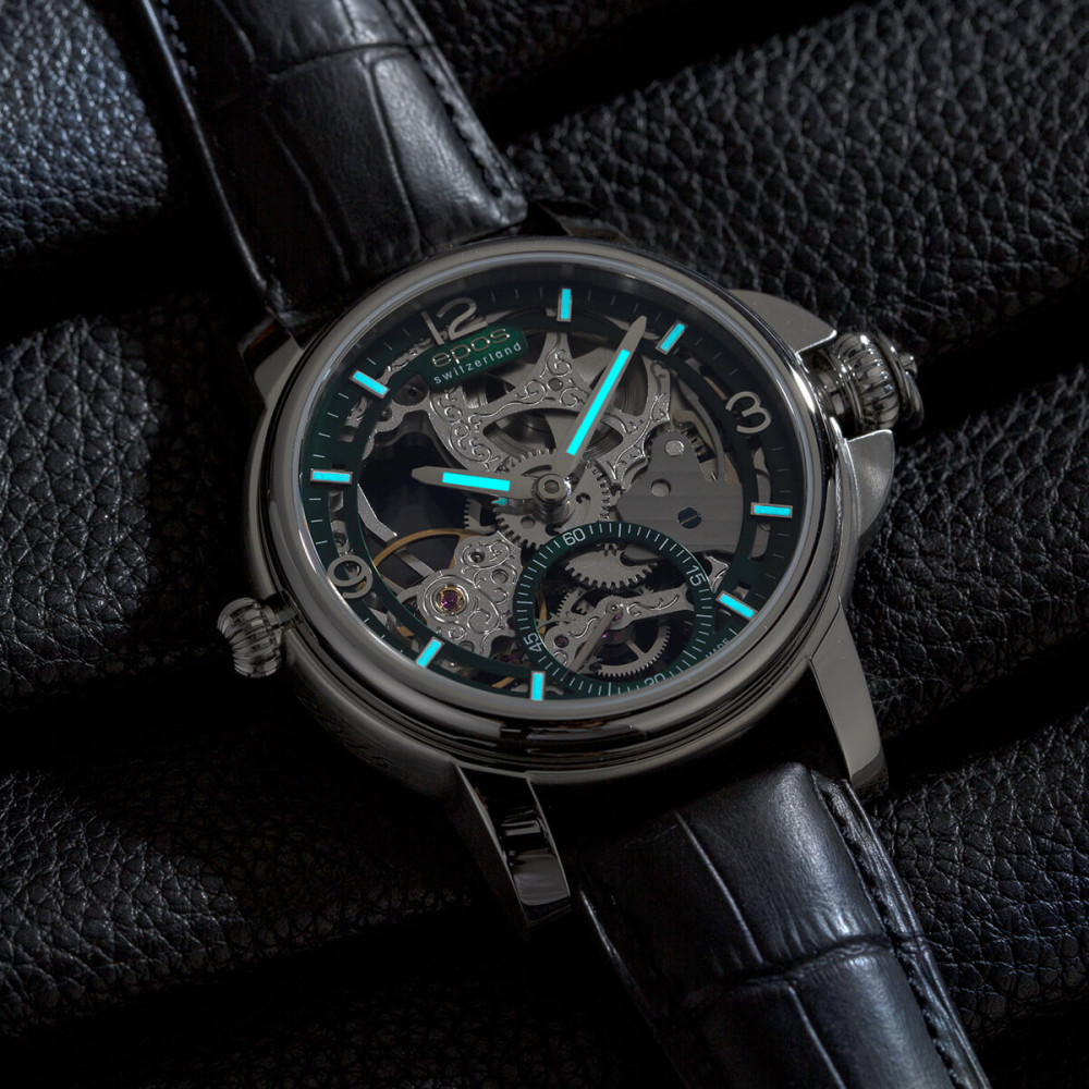 Лимитираният EPOS 3429.195.20.53.25 е швейцарски скелетон с интелигентен 3-в-1 дизайн: може да се носи като ръчен часовник, да се превърне в джобен (в комплект със стоманена верижка) или да се използва като настолен. Напълно скелетираният Unitas 6498 с ръчно навиване разкрива богатите гравюри и малката секундна стрелка на 6 часа. Корпусът от благородна стомана (45 мм) е съчетан с сапфирено стъкло отпред и прозрачен минерален гръб, а водоустойчивостта 5 ATM го прави надежден за ежедневието. Черната кожена каишка завършва елегантния, колекционерски характер.
