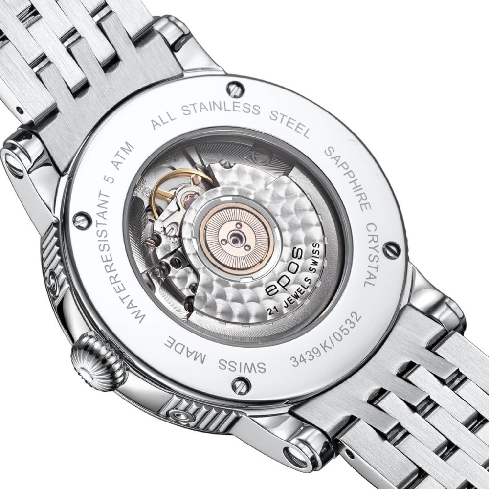 Механизмът Sellita SW300 / ETA 2892-A2 е изцяло декориран и видим през сапфирен прозрачен гръб, а корпусът и верижката от благородна стомана придават съвременен и устойчив характер.