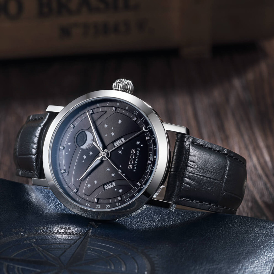 Тъмносивият циферблат напомня нощно небе, а апликираните луминисцентни индекси придават дълбочина и магнетичен блясък. Под него работи премиум Sellita SW300 / ETA 2892-A2 механизъм с автоматично навиване, видим през сапфирения прозрачен гръб. Корпусът от благородна стомана (42 мм) е съчетан с черна кожена каишка, осигуряваща комфорт и класическа визия.