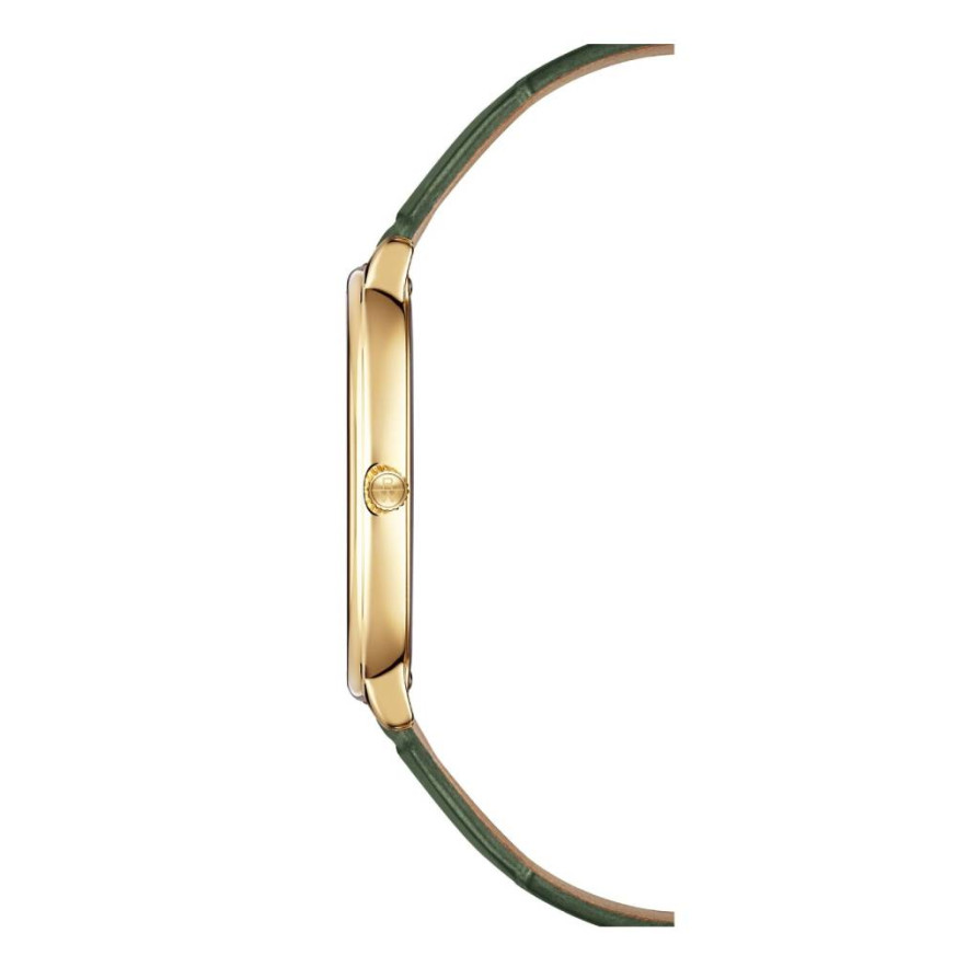 Часовник Raymond Weil Toccata 5280-PC-64001 е елегантен дамски швейцарски модел, който съчетава класическа естетика и модерни цветови акценти. Правоъгълният корпус от благородна стомана с PVD покритие от жълто злато придава луксозно излъчване, а сребристият циферблат допълва изчистения дизайн. Зелената кожена каишка от висококачествена телешка кожа добавя индивидуалност и стил. Надеждният кварцов механизъм и сапфир-кристалът гарантират прецизност и дълготрайност.