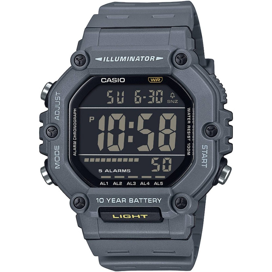 Casio AE-1600H-8BVEF от серията Collection Men е надежден спортно-ежедневен часовник, създаден за активно ежедневие. Моделът предлага множество функции – 5 аларми, почасов сигнал, автоматичен календар, хронометър, таймер за обратно броене и snooze функция. Дигиталният дисплей е с LED подсветка за отлична четимост в тъмни условия, а часовият формат може да се избира между 12/24 часа. Корпусът и каишката са от лек и устойчив полимер, защитени с минерално стъкло. С водоустойчивост до 100 м и 10-годишен живот на батерията, този модел е практичен и издръжлив избор за динамичния мъж.