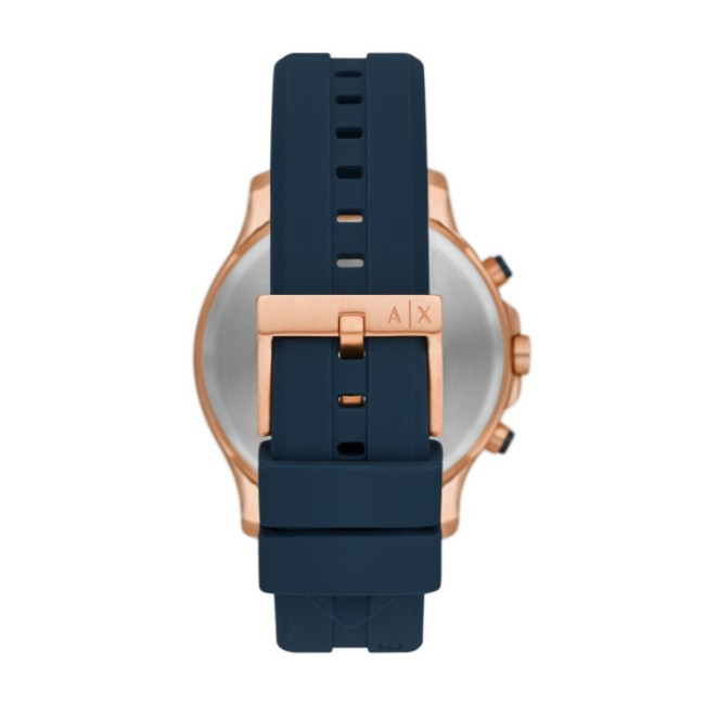 Мъжки Часовник Armani Exchange AX2440 Armani Exchange AX2440 от колекция Hampton e мъжки кварцов часовник със син кръгъл циферблат, розовозлатист корпус от неръждаема стомана с диаметър 46 mm и синя каишка 22 mm, изработена от силикон.