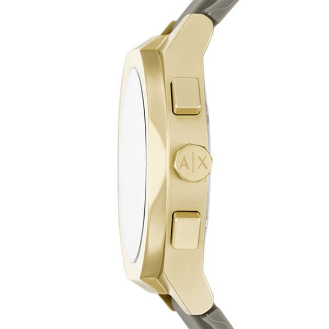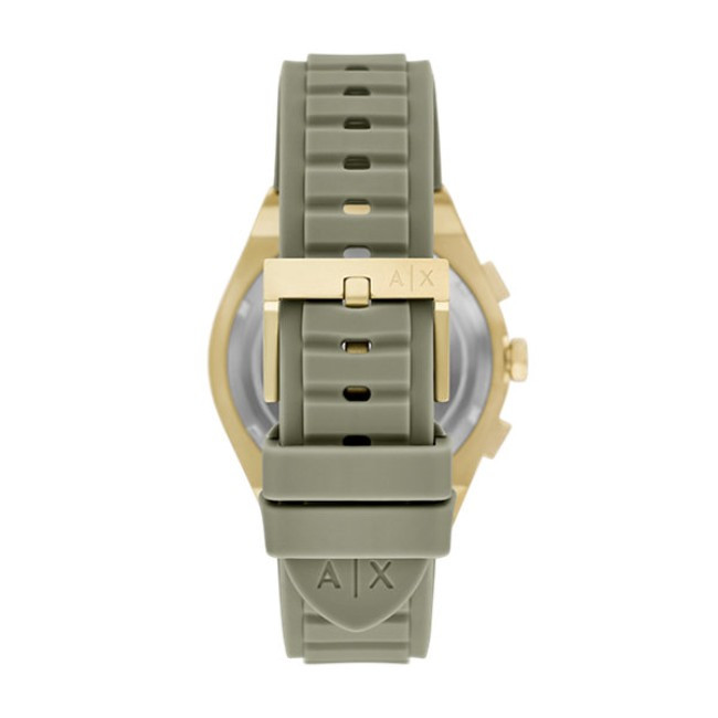 Мъжки Часовник Armani Exchange AX4197   Armani Exchange AX4197 от колекция Sync e мъжки кварцов часовник със зелен кръгъл циферблат, златист корпус от неръждаема стомана с диаметър 42 mm и зелена каишка 16 mm, изработена от силикон.