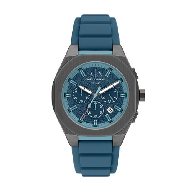 Мъжки Часовник Armani Exchange AX4291   Armani Exchange AX4291 от колекция Sync e мъжки кварцов часовник със син кръгъл циферблат, gunmetal корпус от неръждаема стомана с диаметър 44 mm и синя каишка OTHER mm, изработена от силикон.