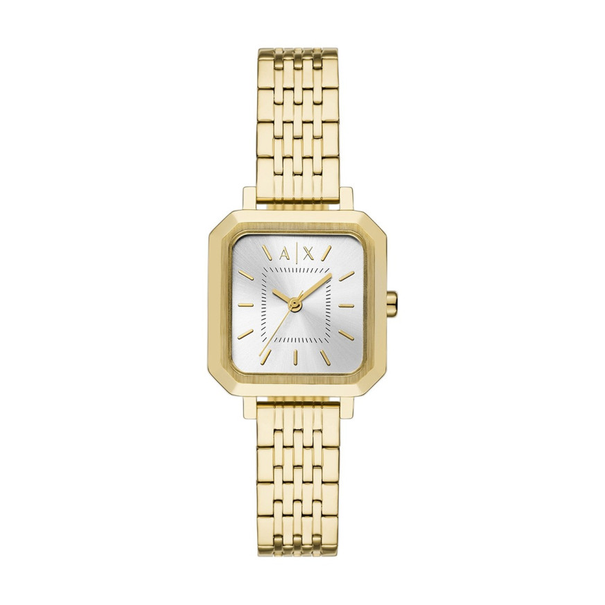 Дамски Часовник Armani Exchange AX5725   Armani Exchange AX5725 от колекция Leila e дамски кварцов часовник със сребрист правоъгълен, north-south циферблат, златист корпус от неръждаема стомана с диаметър 27 mm и златиста верижка 12 mm, изработена от неръждаема стомана.