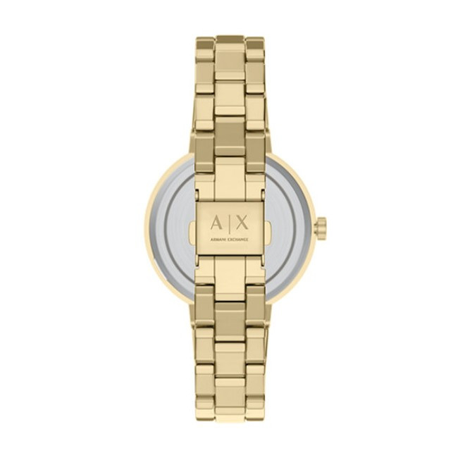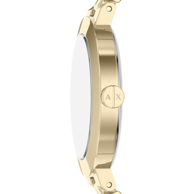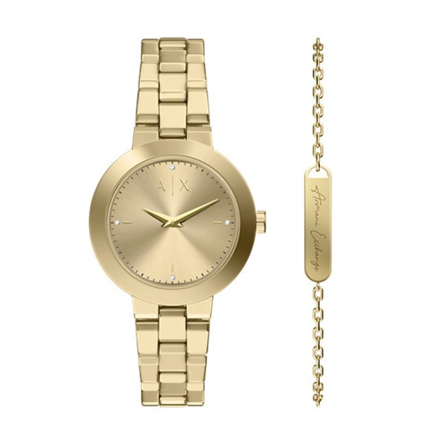 Дамски Сет Armani Exchange AX7177SET   Armani Exchange AX7177SET от колекция Jackie e сет от дамски кварцов часовник и златиста гривна от неръждаема стомана. Часовникът е със златист кръгъл циферблат, златист корпус от неръждаема стомана с диаметър 36 mm и златиста верижка 16 mm, изработена от неръждаема стомана.