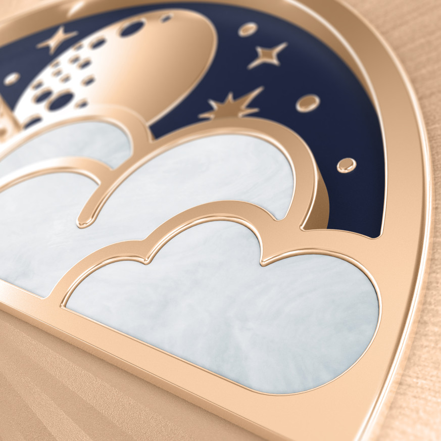 Циферблатът въплъщава върховете на Ар Деко стила – изискана симетрия, бляскав слънчев гилош и диамантено финиширани индекси. Истински седеф създава мистична дълбочина, а лунният диск, обрамчен в облачни мотиви и 3D дизайн, приканва погледа да се изгуби в хоризонта. Дори полираните нитове по ръба на минутния ринг носят ехо от легендарните самолети на Златната ера на авиацията.