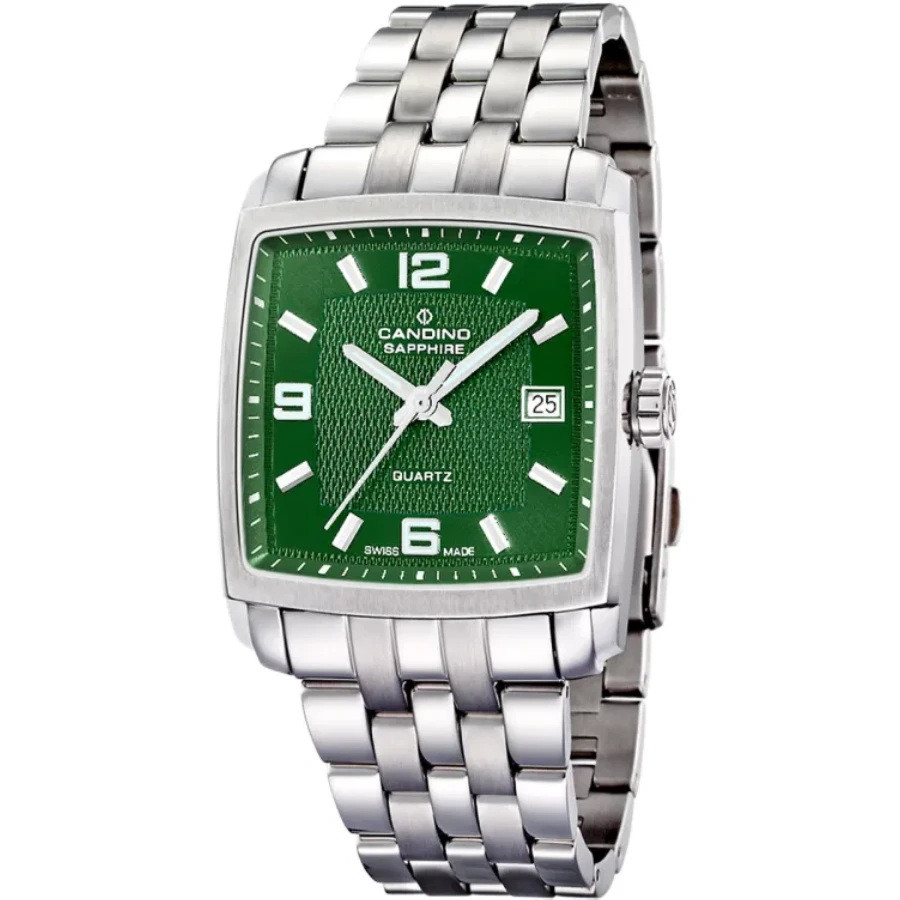 Candino C4372/K е мъжки швейцарски часовник, който се отличава с нестандартен квадратен корпус и елегантна визия. Зеленият циферблат придава модерен и отличим характер, комбиниран с арабски цифри и индекси за по-добра четимост. Корпусът от благородна стомана с размер 36 мм осигурява компактно и удобно прилягане, а стоманената верижка допълва изчистения дизайн. Моделът е оборудван със сапфир-кристал, устойчив на надраскване, и швейцарски кварцов механизъм с функция дата, гарантиращ точност и надеждност.