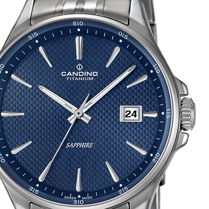 Candino C4606/B от колекция Titanium е мъжки швейцарски часовник, който съчетава лекота, здравина и модерен стил. Корпусът и верижката от титан осигуряват изключително ниско тегло и висока устойчивост, което го прави идеален за ежедневно носене. Синият циферблат придава дълбочина и елегантен характер, допълнен от индекси, дата на позиция 3 часа и луминисцентно покритие за по-добра видимост. Моделът е оборудван със сапфир-кристал, устойчив на надраскване, и швейцарски кварцов механизъм, гарантиращ прецизност и надеждност.