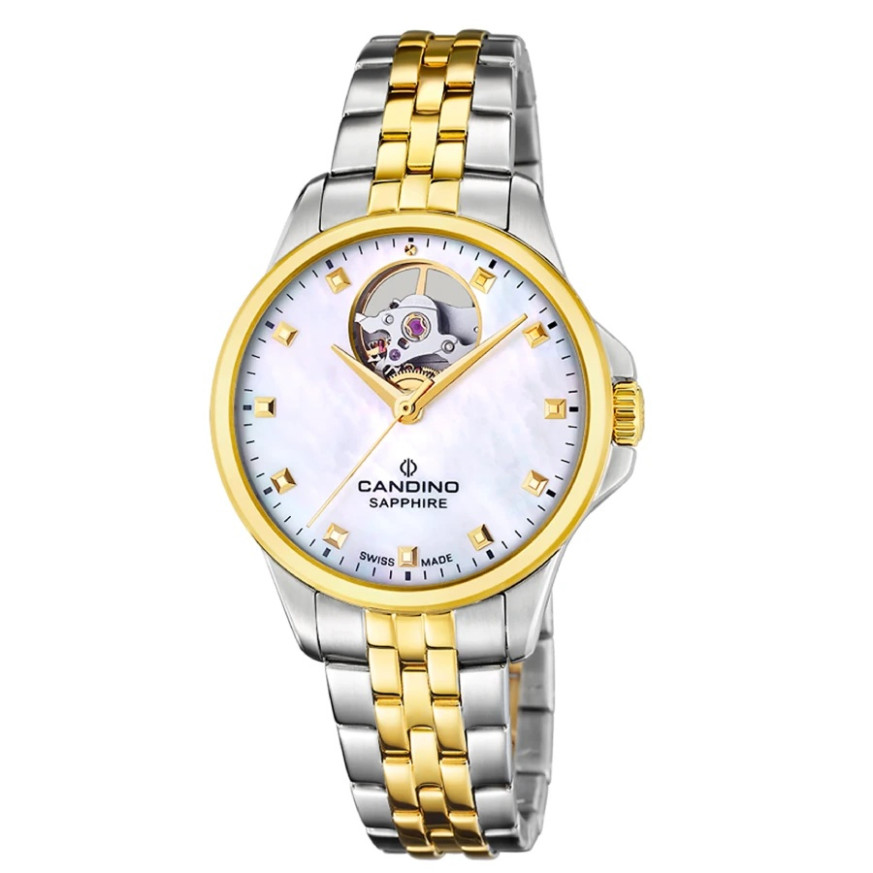 Candino C4771/A Automatic е дамски швейцарски часовник от колекция Automatic, който комбинира прецизна механика и елегантна визия. Седефеният циферблат създава деликатен блясък, а open heart дизайнът разкрива движението на автоматичния механизъм, придавайки динамика и характер. Корпусът от благородна стомана с размер 34 мм осигурява изискано и удобно прилягане на китката. Двуцветната верижка допълва визията с модерен акцент. Сапфир-кристалът осигурява защита от надраскване, а автоматичният механизъм Soprod гарантира високо ниво на швейцарска прецизност.