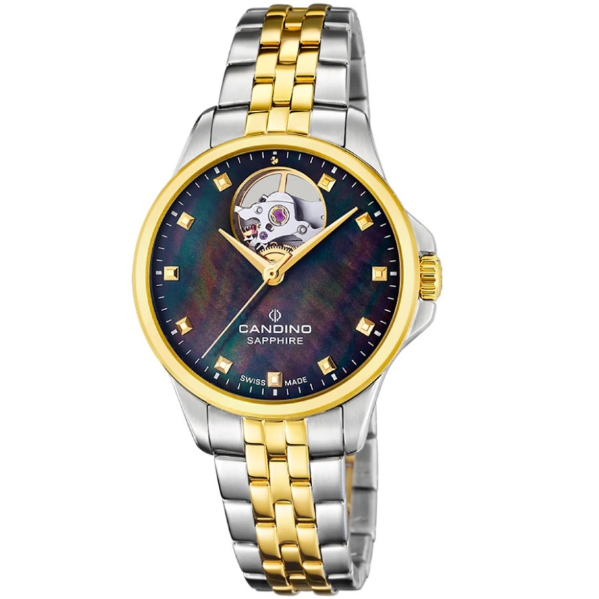 Candino C4771/B Automatic е дамски швейцарски часовник от колекция Automatic, който съчетава прецизна механика и изискан дизайн. Седефеният циферблат създава деликатен блясък, а open heart прозорецът разкрива движението на автоматичния механизъм, придавайки динамика и характер на модела. Корпусът от благородна стомана с размер 34 мм осигурява елегантно прилягане, а двуцветната верижка добавя стилен контраст. Сапфир-кристалът предпазва от надраскване, а автоматичният механизъм Soprod гарантира високо ниво на швейцарска прецизност.