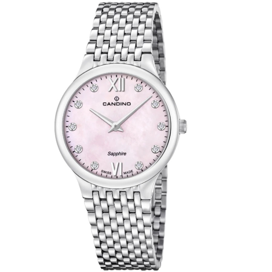 Candino C4787/2 от колекция Candino 1947 е дамски швейцарски часовник, съчетаващ деликатна елегантност и изчистена визия. Седефеният циферблат придава фин блясък и нежно излъчване, допълнен от изчистени индекси и дискретен прозорец за дата. Корпусът и верижката от благородна стомана осигуряват универсален стил, подходящ както за ежедневие, така и за по-елегантни поводи. Размерът от 33.5 мм гарантира комфортно и балансирано прилягане на китката. Моделът е оборудван с швейцарски кварцов механизъм RONDA 1062, осигуряващ надеждност и прецизност, а сапфир-кристалът предпазва от надраскване.