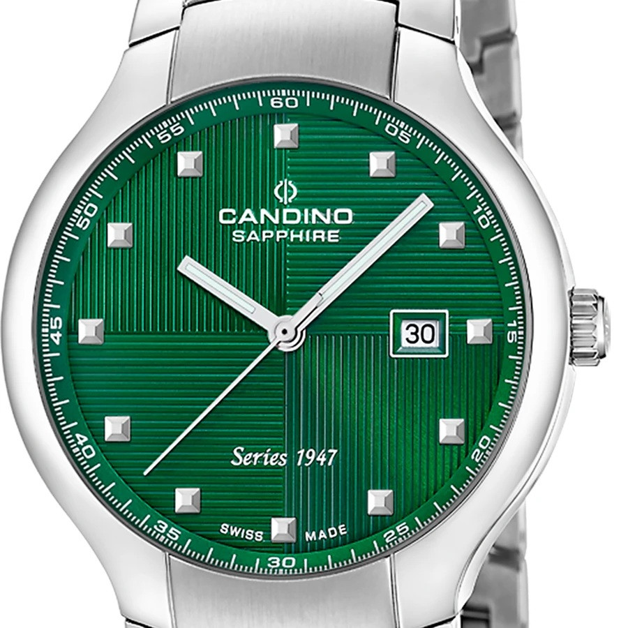 Candino C4792/2 от колекция Candino 1947 е мъжки швейцарски часовник, който съчетава класическа визия с модерен цветови акцент. Зеленият релефен циферблат с фини точкови индекси придава дълбочина и индивидуалност, като същевременно запазва елегантния характер на модела. Корпусът от благородна стомана с размер 40 мм осигурява балансирано присъствие на китката. Задвижван от швейцарски кварцов механизъм RONDA 705, часовникът гарантира надеждност и прецизност. Сапфир-кристалът осигурява висока устойчивост на надраскване, а водоустойчивостта от 10 ATM го прави практичен избор за динамично ежедневие.