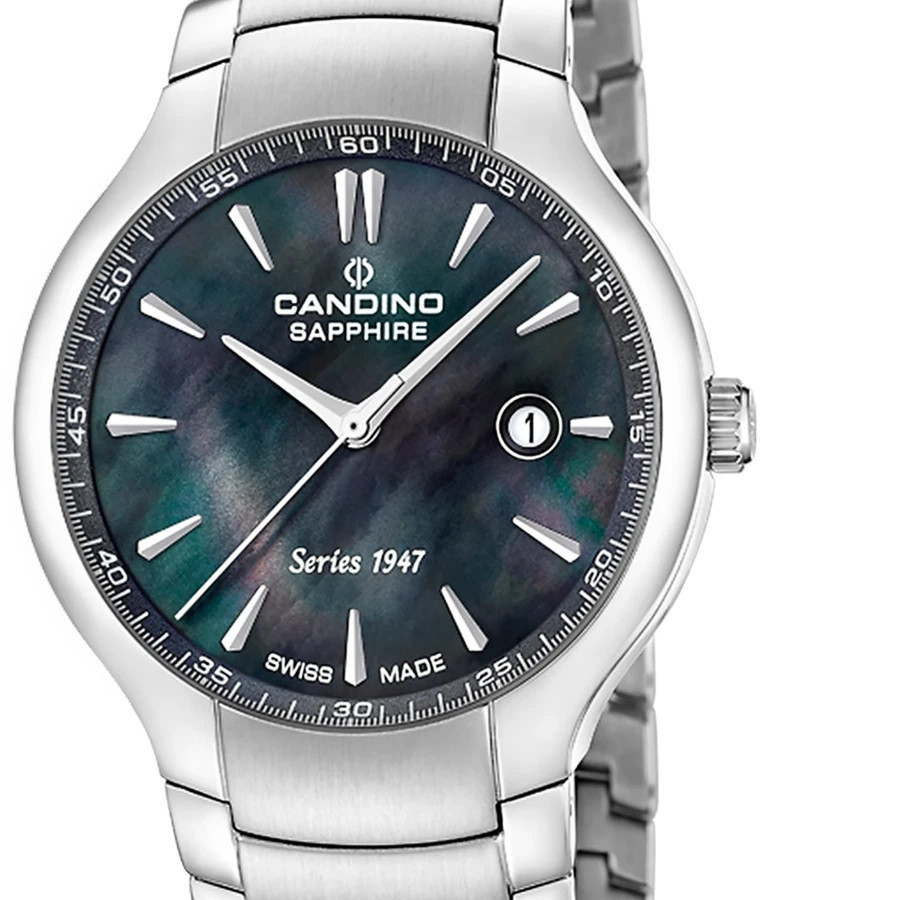 Candino C4793/2 от колекция Candino 1947 е дамски швейцарски часовник, който съчетава деликатен дизайн и висока прецизност. Седефеният циферблат създава фин и елегантен блясък, подчертан от изчистени индекси и дискретен прозорец за дата. Корпусът от благородна стомана с размер 34 мм осигурява удобно и хармонично прилягане на китката. Моделът е оборудван с швейцарски кварцов механизъм Harley 785 (M785), гарантиращ надеждност и точност. Сапфир-кристалът предпазва от надраскване, а водоустойчивостта от 10 ATM добавя практичност към елегантната визия.