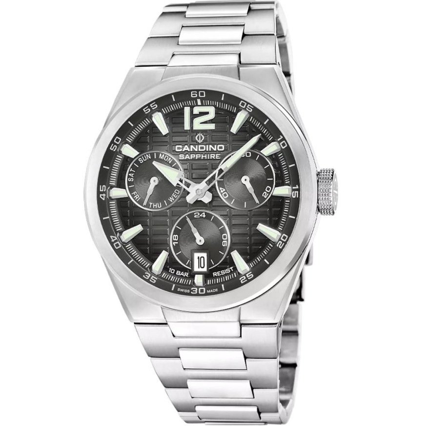 Часовник Candino C4796/4 комбинира швейцарска прецизност и функционален дизайн в изтънчен корпус от благородна стомана. Черният циферблат е обогатен с изнесен секундарник на 3 часа, 24-часов индикатор на 6 часа и ден от седмицата на 9 часа, което придава динамичен и професионален облик. Моделът е защитен със сапфир-кристално стъкло, устойчиво на надрасквания, и задвижван от надеждния швейцарски кварцов механизъм Ronda X30. Фосфоресциращите стрелки и индекси, заедно с водоустойчивостта до 10 ATM, гарантират удобство и сигурност във всяка ситуация.