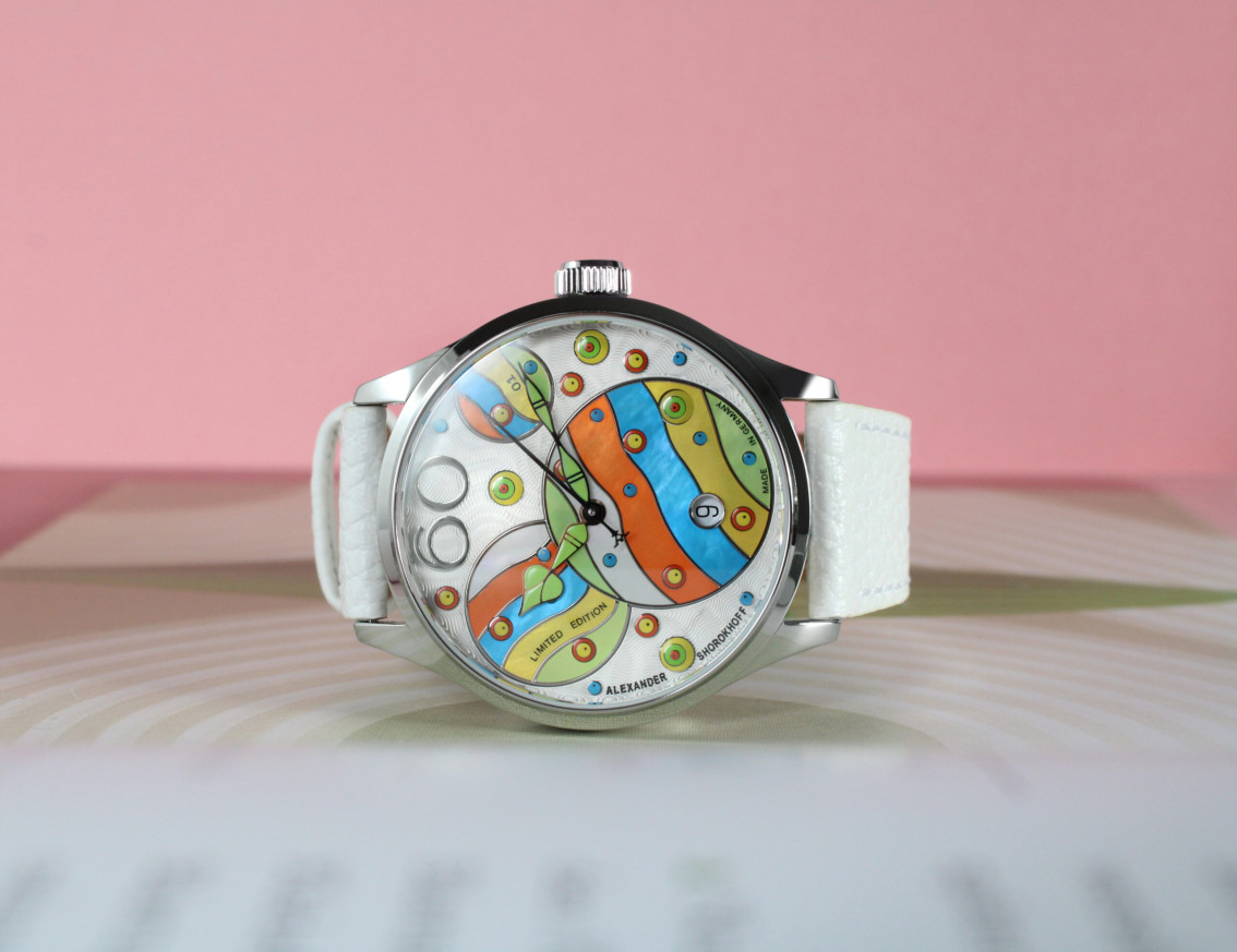 Моделът Crazy Balls 2 е създаден за хора с усет към изкуството и индивидуалността. Цветните сфери върху циферблата танцуват в хармония – някои са върху перла, други блестят в живи тонове, докато голямото “60” - емблема на Alexander Shorokhoff, завършва композицията.