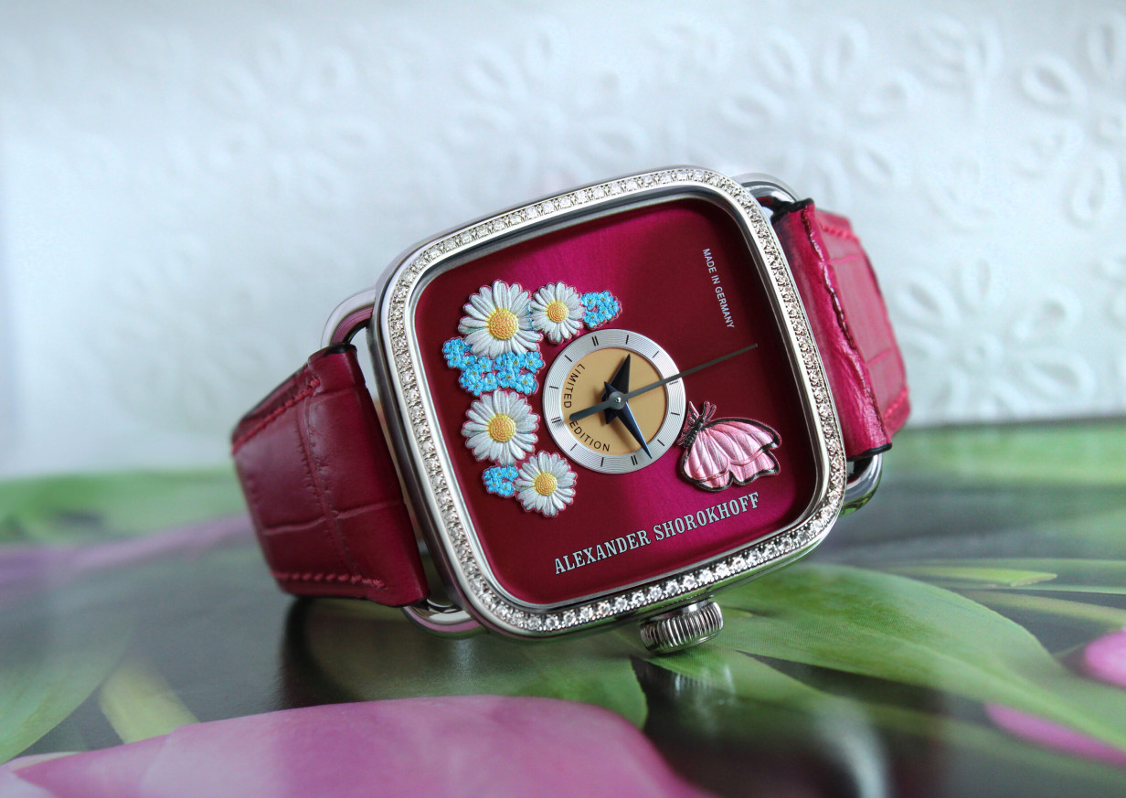 Часовник Alexander Shorokhoff SUMMER 36x36mm AS.AP.SOM2D е лимитирано дамско издание от едва 19 броя, съчетаващо изкуство и часовникарска прецизност. С корпус от благородна стомана с диаманти и уникален бордо циферблат с 3D флорални апликации и пеперуда, този модел олицетворява нежност и магия. Вътре работи автоматичен механизъм ETA 2000-1 с 40 часа резерв. Крокодилската кожена каишка завършва изискания стил. Истински шедьовър за ценители, които търсят елегантност, индивидуалност и колекционерска стойност.