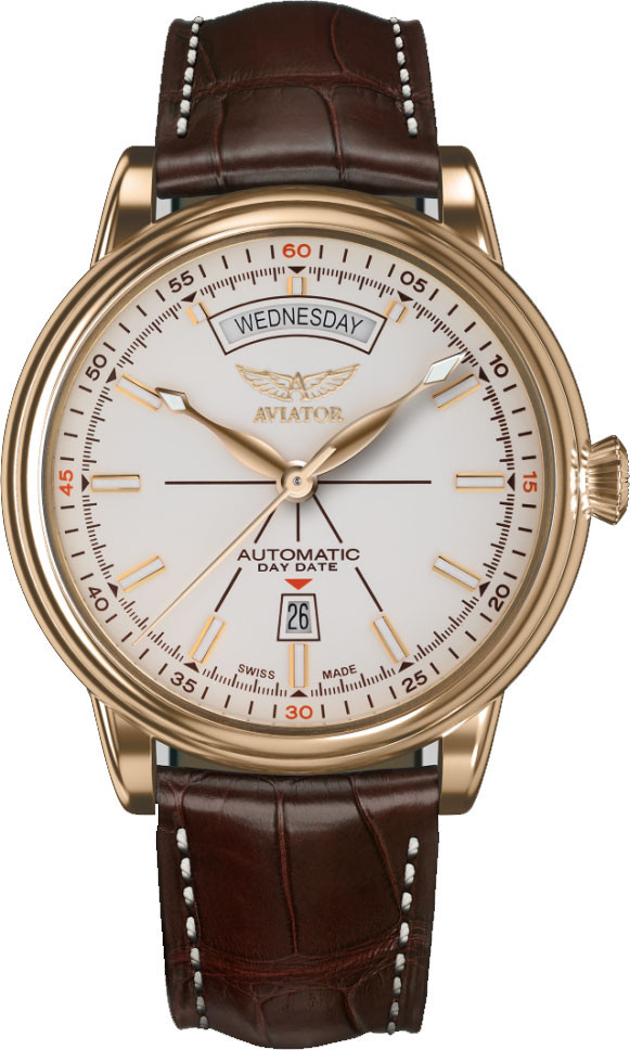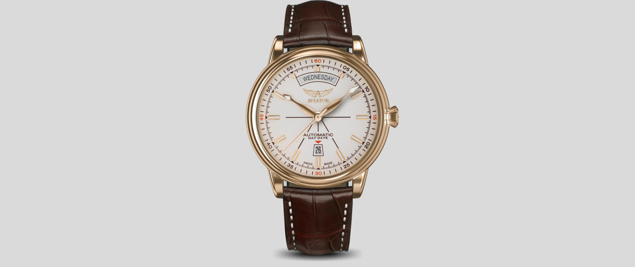 AVIATOR Douglas Day Date впечатлява с изящна слънчева шлифовка на циферблата, елегантно извито прозорец за деня и трапецовидна дата, които допълват класическия облик. Тъй като четливостта и прегледността са ключови характеристики, колекцията Douglas Day Date съчетава Арт Деко дизайн и функционалност в перфектна хармония.