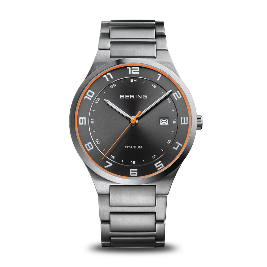 Смел дизайн, лек на китката – този мъжки часовник BERING Titanium съчетава спортна енергия със скандинавска яснота.Черният циферблат, озарен със слънчеви лъчи, си играе със светлина, ограден от ярко оранжева минутна стрелка – динамичен контраст, който придава на часовника уверен, мъжествен вид. Ясните арабски цифри, 24-часовият вътрешен пръстен и прозорецът за дата на 3 часа предлагат отлична четливост и функционалност. Оранжевата секундна стрелка добавя пулс на енергия.