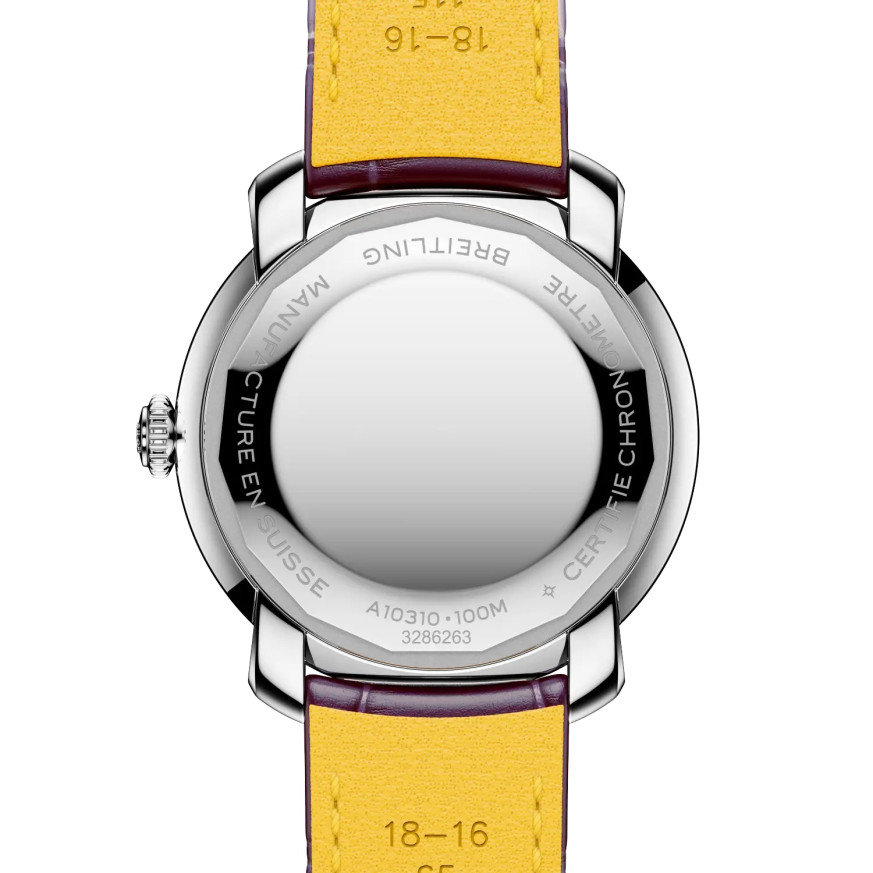 Часовник BREITLING Lady Premier Automatic 36 A10310121Q1P1 е израз на неподправена женственост и модерна елегантност. Стоманеният корпус с диаметър 36 мм е съчетан с виолетов циферблат, минималистични индекси и елегантни стрелки „lozenge“. Под капака работи автоматичният калибър Breitling 10, сертифициран от COSC, с резерв на енергия до 42 часа. Каишката от кожа на алигатор с клипс придава луксозен характер. Водоустойчив до 100 м, този модел е идеален за дами, които ценят съчетанието на стил, комфорт и надеждност.