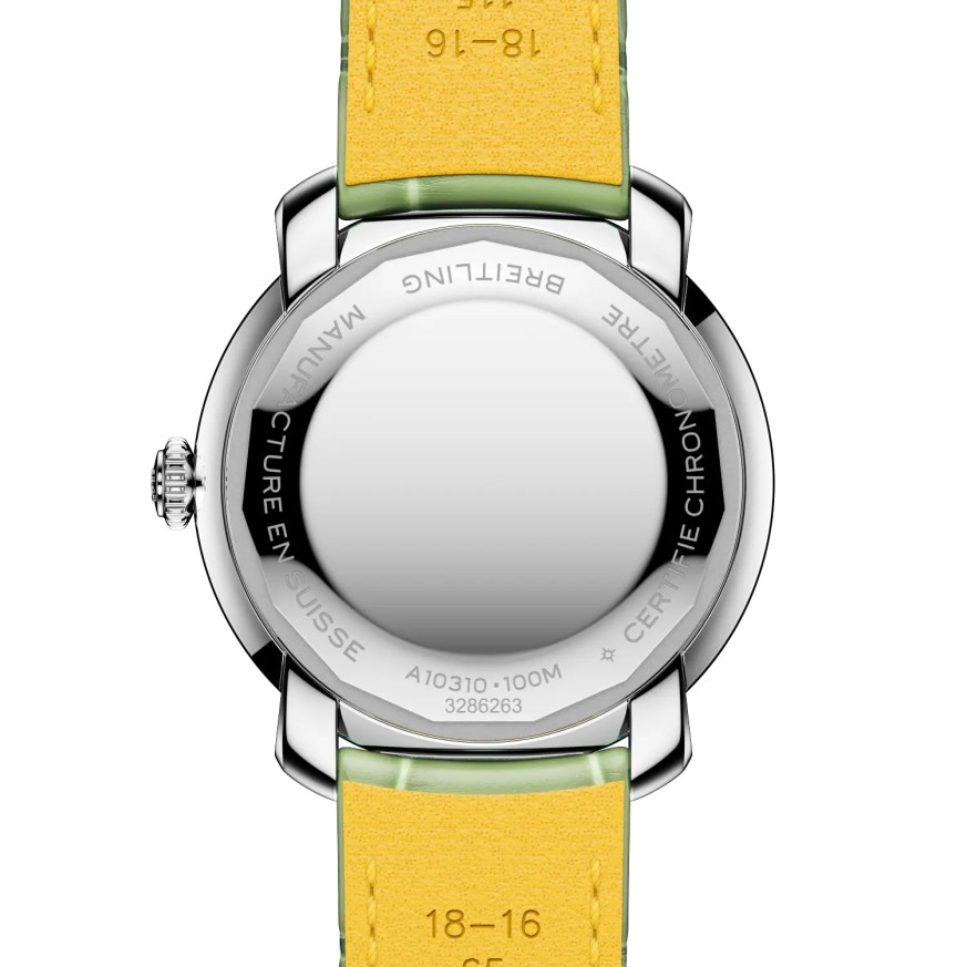 Часовник BREITLING Lady Premier Automatic 36 A10310671L1P1 съчетава бижутерийна елегантност и швейцарска прецизност. Корпусът от благородна стомана с диаманти е съчетан със свеж ментов циферблат, минималистични индекси и стрелки „lozenge“. Захранван от автоматичния калибър Breitling 10 с 42 часа резерв и COSC сертификация, моделът предлага надеждност и престиж. Каишката от кожа на алигатор с клипс придава изискан завършек. Водоустойчив до 100 м, Lady Premier е символ на увереност, женственост и неподправен стил, вдъхновен от наследството на Beatrice Breitling.