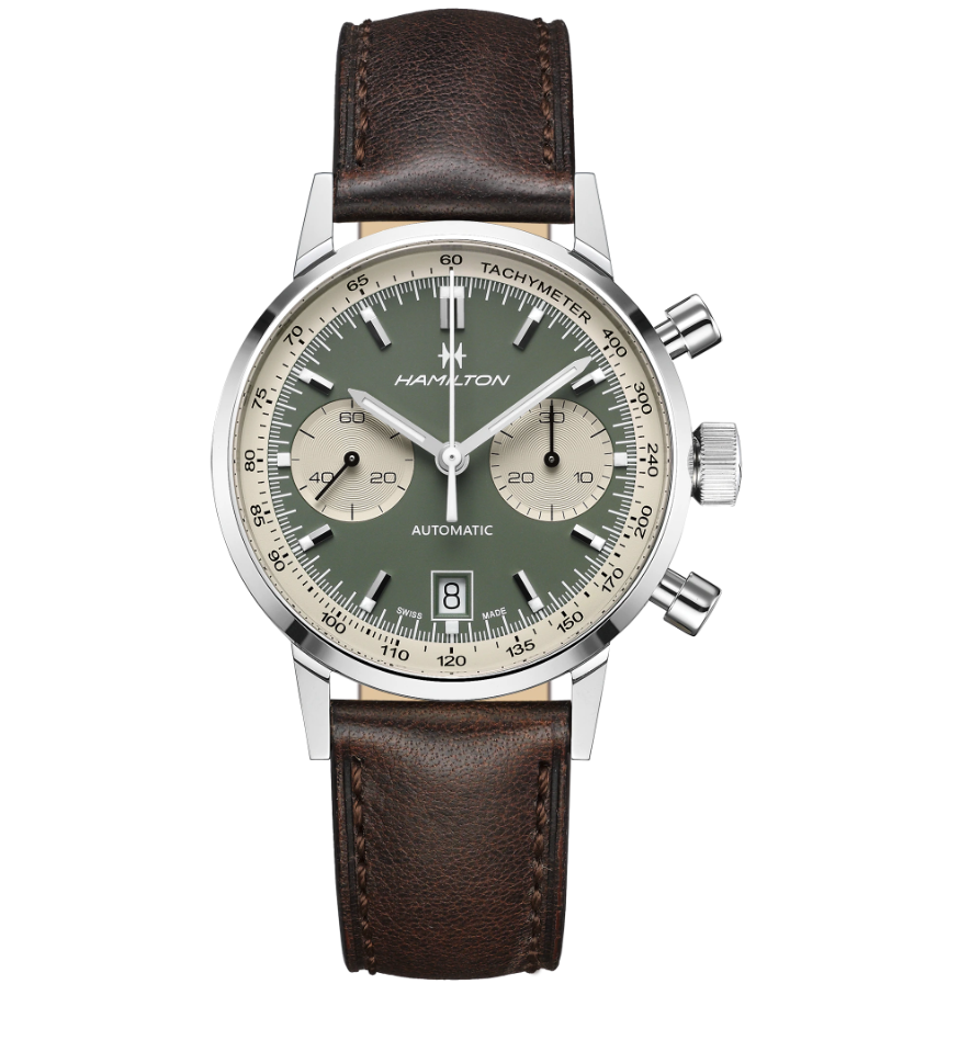 Часовник Hamilton American Classic Intra Matic Auto Chrono 40mm H38416560 съчетава винтидж вдъхновение от 1968 г. с модерна механична прецизност. Зеленият „panda“ циферблат с бели контрастни подциферблати придава ретро спортен характер, а автоматичният калибър H-31 осигурява 60 часа резерв на мощност. Сапфир-кристал с антирефлекс, тахиметрична скала, хронограф и 100 м водоустойчивост превръщат модела в стилен и функционален избор за динамично ежедневие.