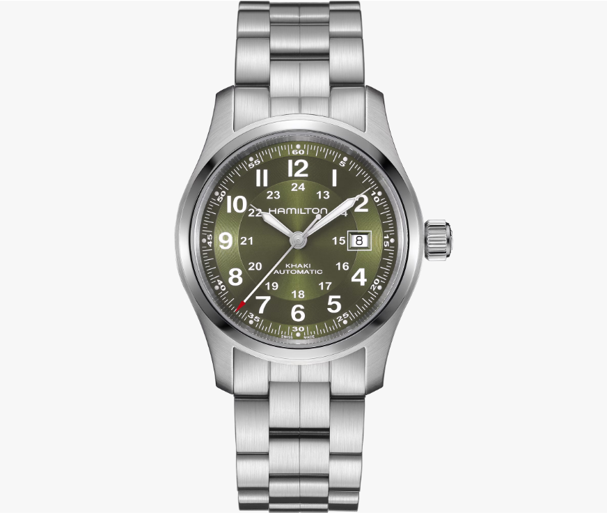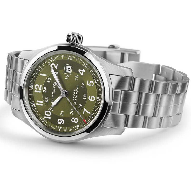 Часовник HAMILTON Khaki Field Auto 42mm H70605160 е автентичен военен модел, модернизиран с детайлен зелен циферблат със Sunray и Snailing ефект. Създаден за съвременните изследователи, този автоматичен часовник с H-10 калибър и до 80 часа резерв предлага функционалност, стил и издръжливост в компактна 38 мм каса от благородна стомана. Перфектен за ежедневие и приключения.