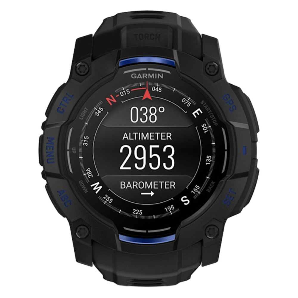 Garmin Instinct Crossover AMOLED Black с Black Limited Edition 50mm 010-03020-03 е здрав GPS смарт часовник с 1,3” AMOLED дисплей и аналогови стрелки, подсилен метален безел и сапфирено стъкло. Поддържа до 24 дни живот на батерията в режим на смарт часовник. Включва LED фенерче, 24/7 мониторинг на здравето с Pulse Ox, HRV и сърдечен ритъм, multi-band SatIQ™ GPS, Garmin Coach и създаване на тренировки. Перфектен за приключения, outdoor активности и спорт.