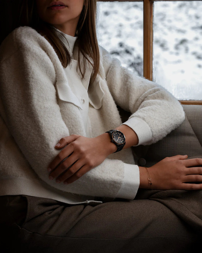Този автоматичен часовник Adventure Sport с диаметър 37 мм е с черен циферблат, върху който се откроява характерният NORQAIN мотив. Разполага с прозорец за дата на 3 часа, а стрелките са покрити със Super-LumiNova®, за да осигурят отлично разчитане на времето при всякакви условия – където и да ви отведат приключенията.