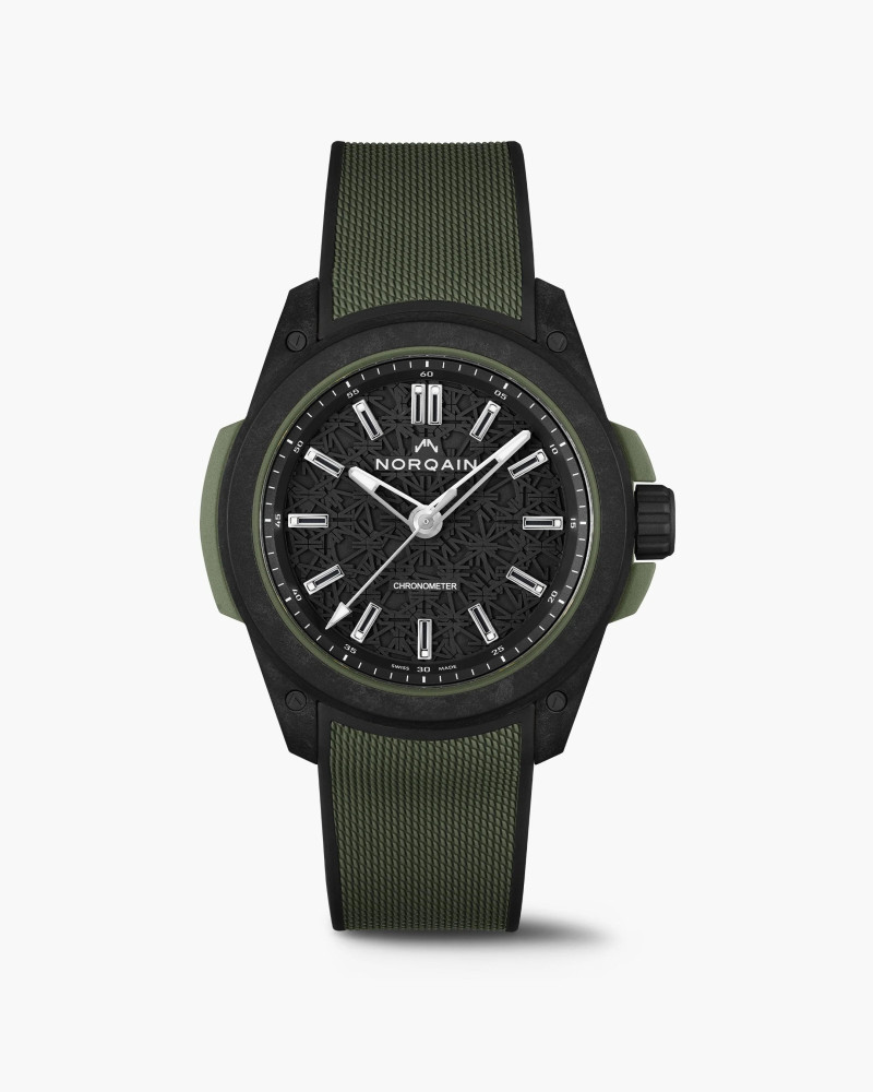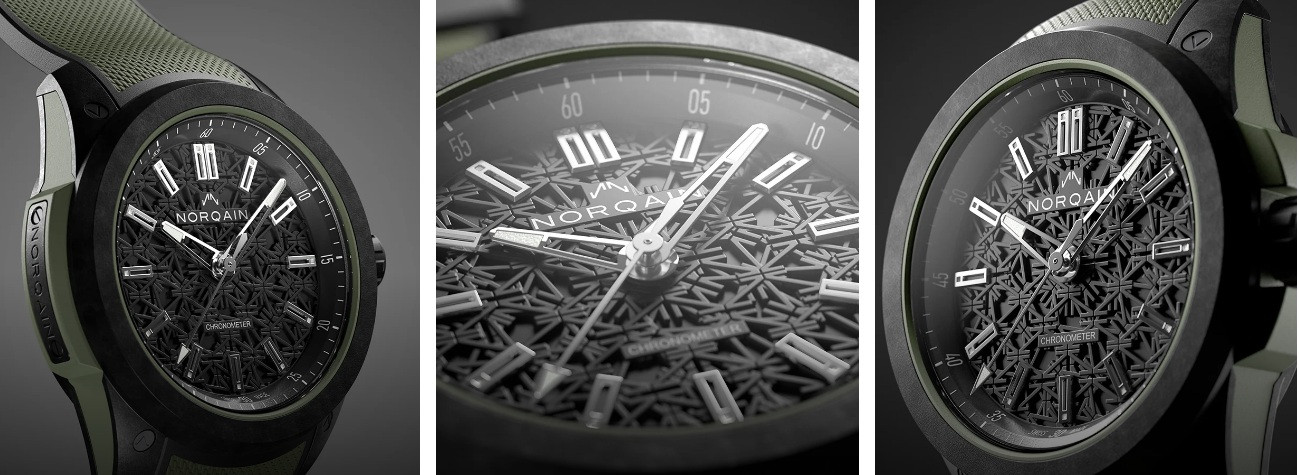 Трислойният циферблат, изрязан с лазер, разкрива детайлен мандала-подобен мотив, вдъхновен от планинското двойно „N“ лого на NORQAIN.