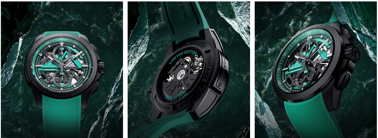 Часовник NORQAIN Independence Skeleton Chrono 42mm Limited Edition 500pcs N3200.40T02.J01 е лимитирано издание от 500 броя, което съчетава авангардна естетика и висока швейцарска прецизност. Скелетонизираният черно-зелен циферблат разкрива COSC-сертифицирания NORQAIN 8K Manufacture Calibre (NK24/1) – автоматичен Flyback хронограф с 62 часа резерв. Корпусът от титан Grade 5 с DLC покритие осигурява изключителна здравина и лекота, съчетани с неподправена елегантност.