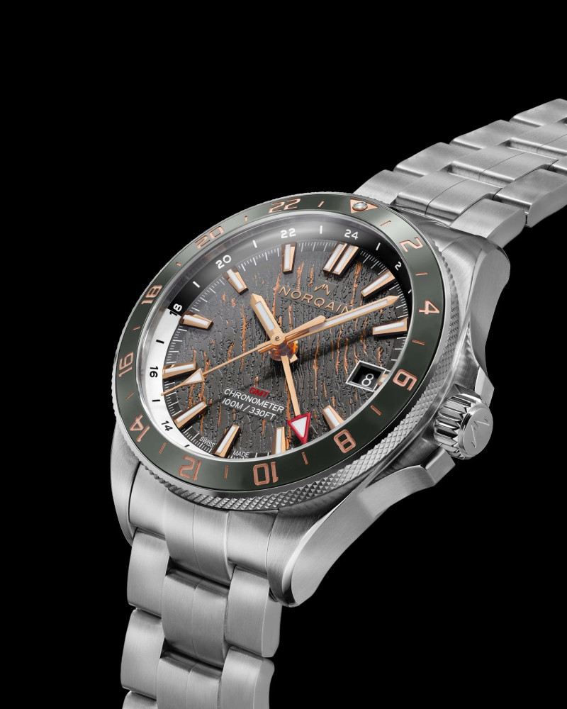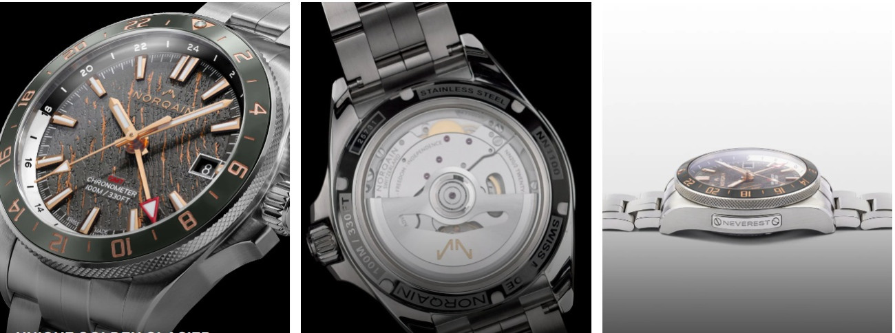 Часовник NORQAIN NEVEREST GMT Glacier 41mm N1100.22S02.G01 комбинира функционалност и изтънчен дизайн, вдъхновен от ледниковите форми на Еверест. Антрацитно-сивият циферблат с златисти „пукнатини“ Glacier и GMT функция за второ часово време подчертават приключенския му характер. В сърцето му работи мануфактурен механизъм NN20/2 от Kenissi, сертифициран по COSC, с 70-часов резерв на енергия. 10% от печалбата се даряват на Butterfly Help Project – в подкрепа на шерпите от Хималаите.