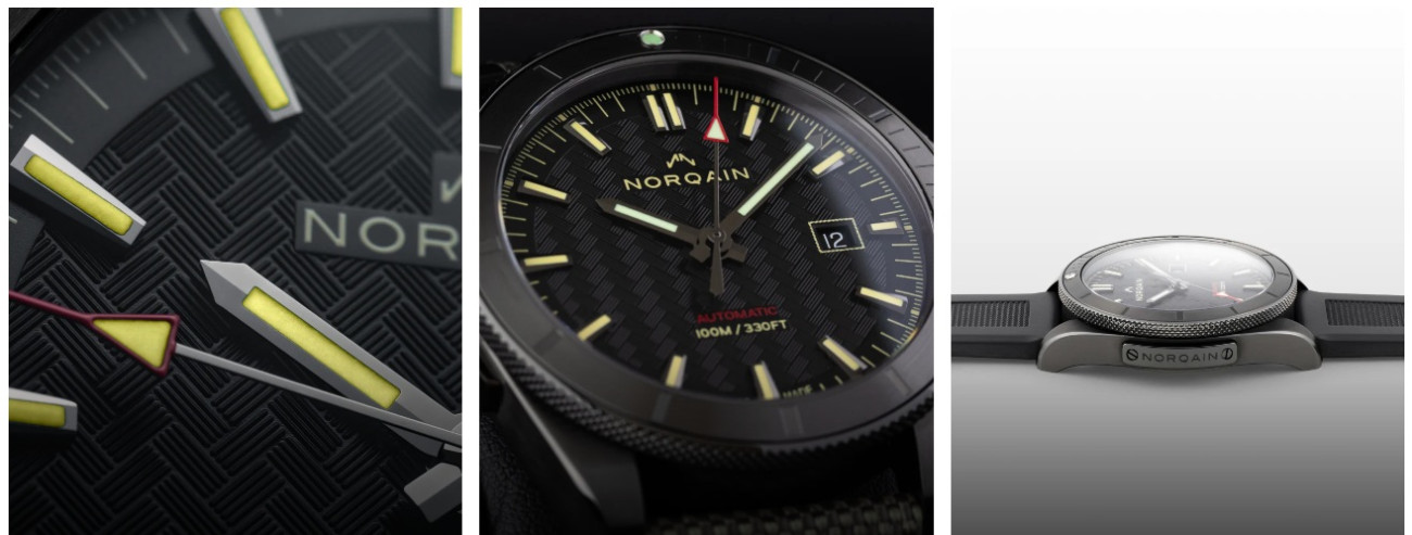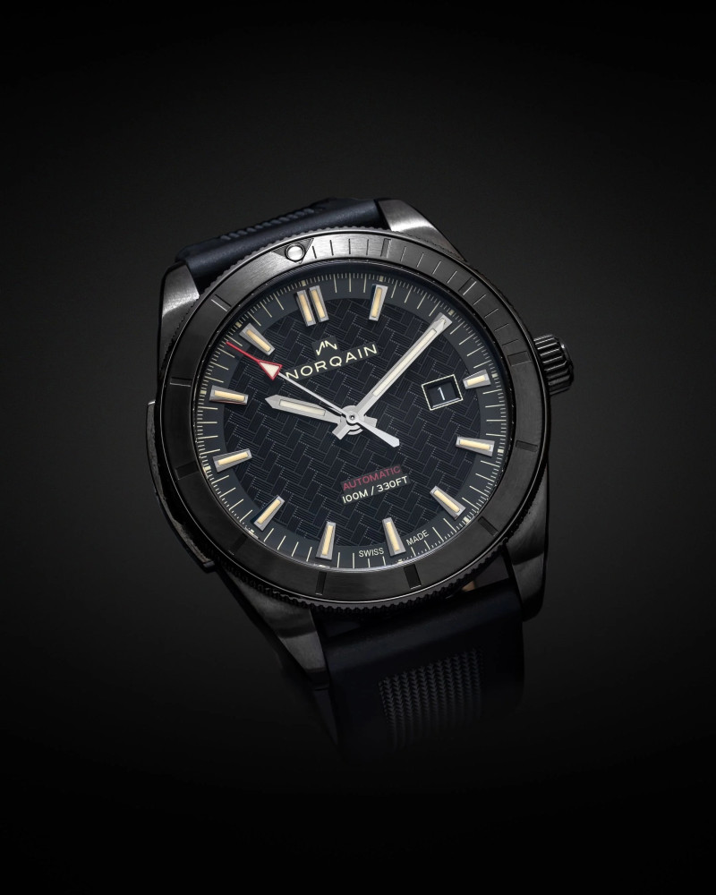 Този 42-милиметров автоматичен Adventure Sport часовник представя отличителния NORQAIN Pattern върху черния си циферблат.