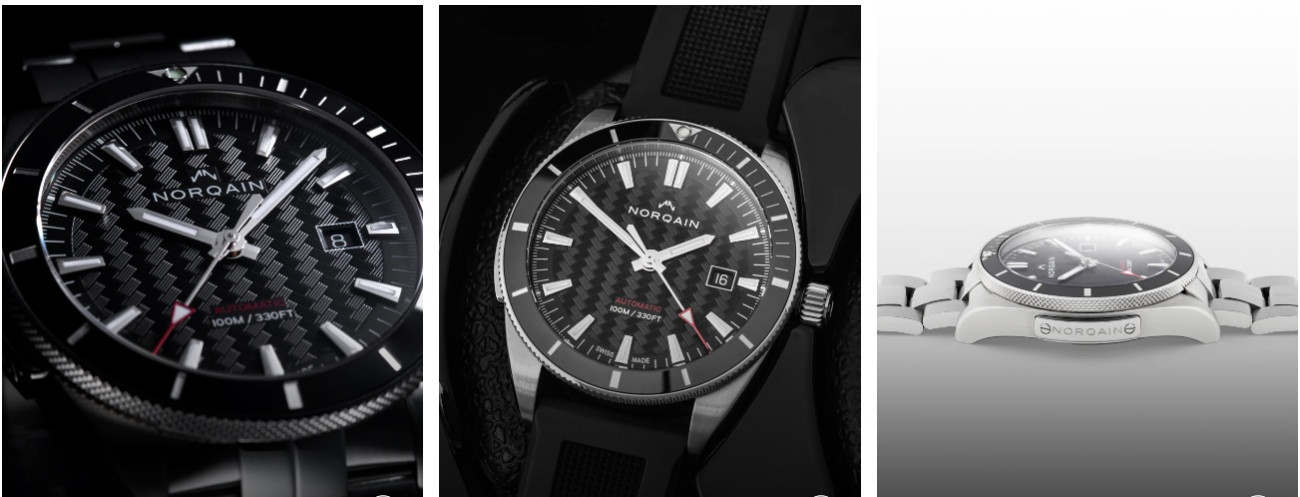 Този автоматичен часовник Adventure Sport с диаметър 42 мм се отличава с характерния NORQAIN релефен модел върху черен циферблат.