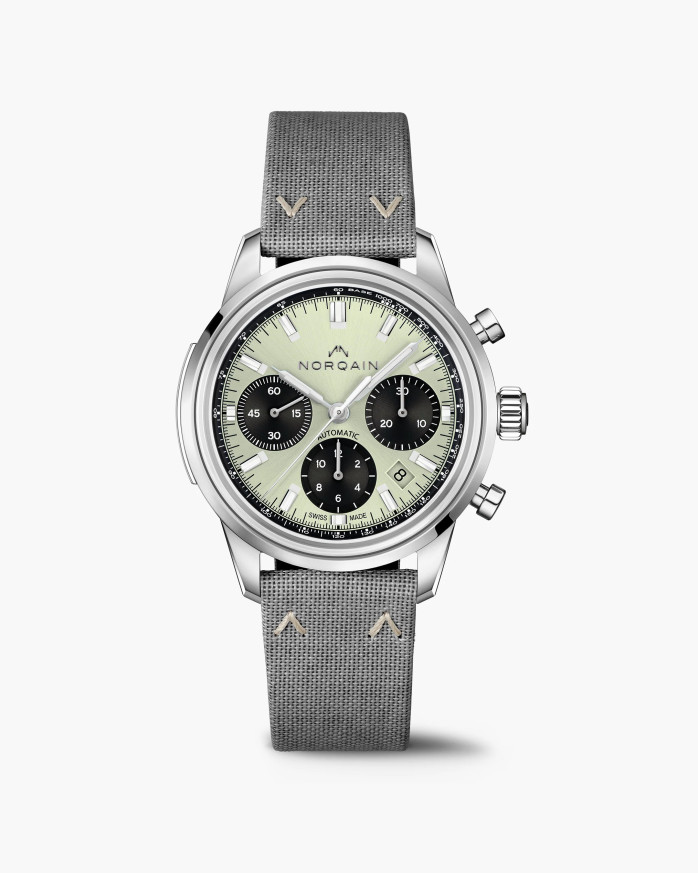 Часовник NORQAIN Freedom 60 Chrono 40mm N2201.19S01.E01 комбинира винтидж вдъхновение с модерна функционалност. Пистачо циферблат със sunray ефект и три контрастни хронографски брояча създават отличителен стил. Автоматичният калибър N19 (SW510 a) осигурява 62 часа резерв и функции като секунди, 30-минутен и 12-часов брояч, плюс дата между 4 и 5 часа. Корпусът от неръждаема стомана е с диаметър 40 мм, водоустойчивост 100 м и сапфирено стъкло. Моделът предлага опция за персонална гравюра върху емблематичната плочка NORQAIN.