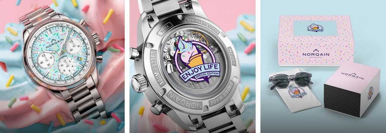 NORQAIN Freedom Chrono Enjoy Life “Sprinkles” със силиконова каишка е най-ежедневната и удобна версия на този отличителен модел. Тук фокусът не е само върху дизайна, а и върху практичността.