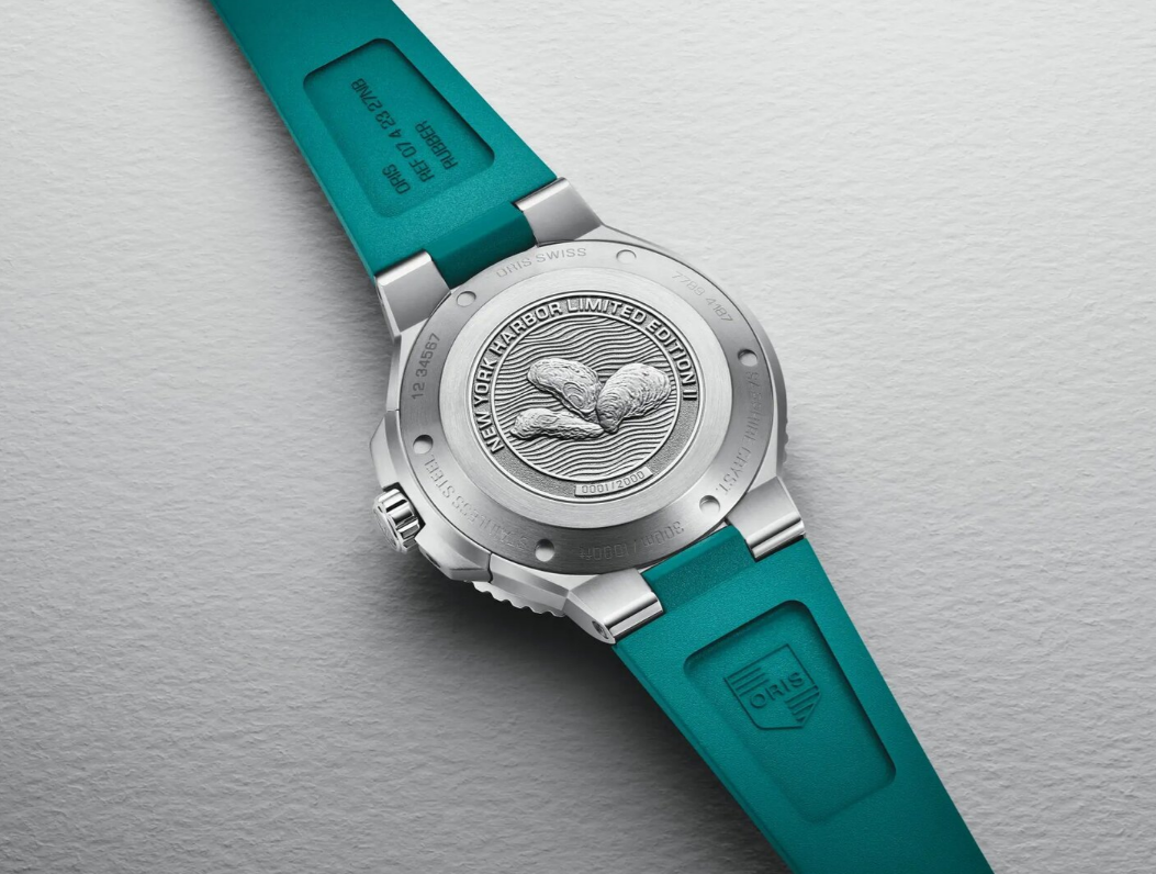 Часовник Oris Aquis New York Harbor Limited Edition 733 7789 4187-Set е лимитирана серия от 2000 броя, създадена в подкрепа на проекта Billion Oyster Project. С корпус от неръждаема стомана, аква зелен циферблат и автоматичен механизъм cal. 733 с 41 часа резерв, този модел съчетава прецизност и екологична мисия. Водоустойчив до 300 м, с сапфир кристал и силиконова каишка, той е символ на стил, отговорност и швейцарско качество.