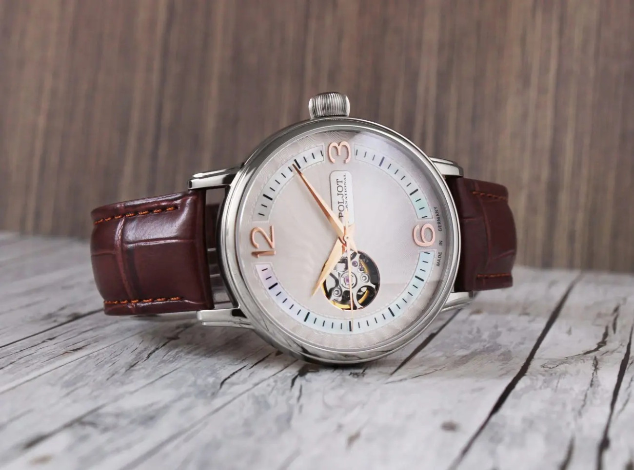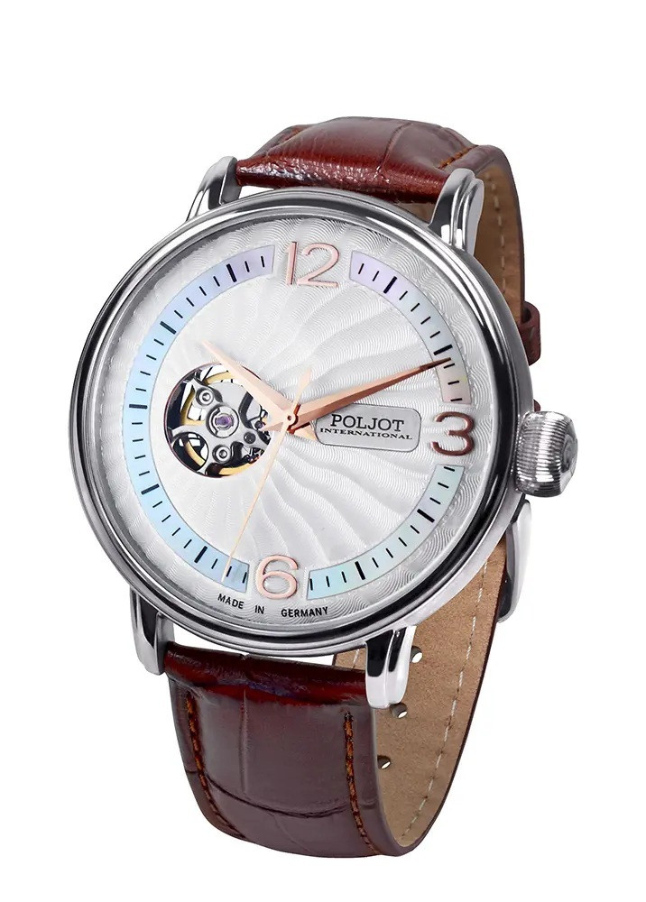 Часовник POLJOT INTERNATIONAL Jaros Open Heart 42mm Limited Edition 100pcs 38NH.4280811 е съвършен баланс между класика и модерна елегантност. Моделът впечатлява с отворен циферблат тип “Open Heart”, който разкрива пулса на автоматичния механизъм Seiko NH38. Сребристо-гилооширан фон, седефени детайли и стрелки в розово злато придават изтънченост и хармония. Произведен в лимитирана серия от 100 броя, този часовник съчетава традиция, стил и съвременен дух.