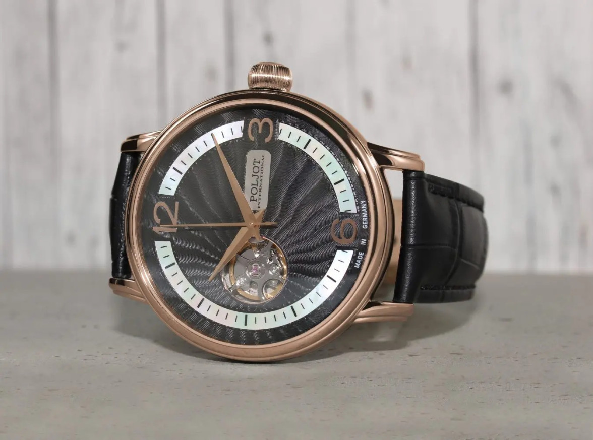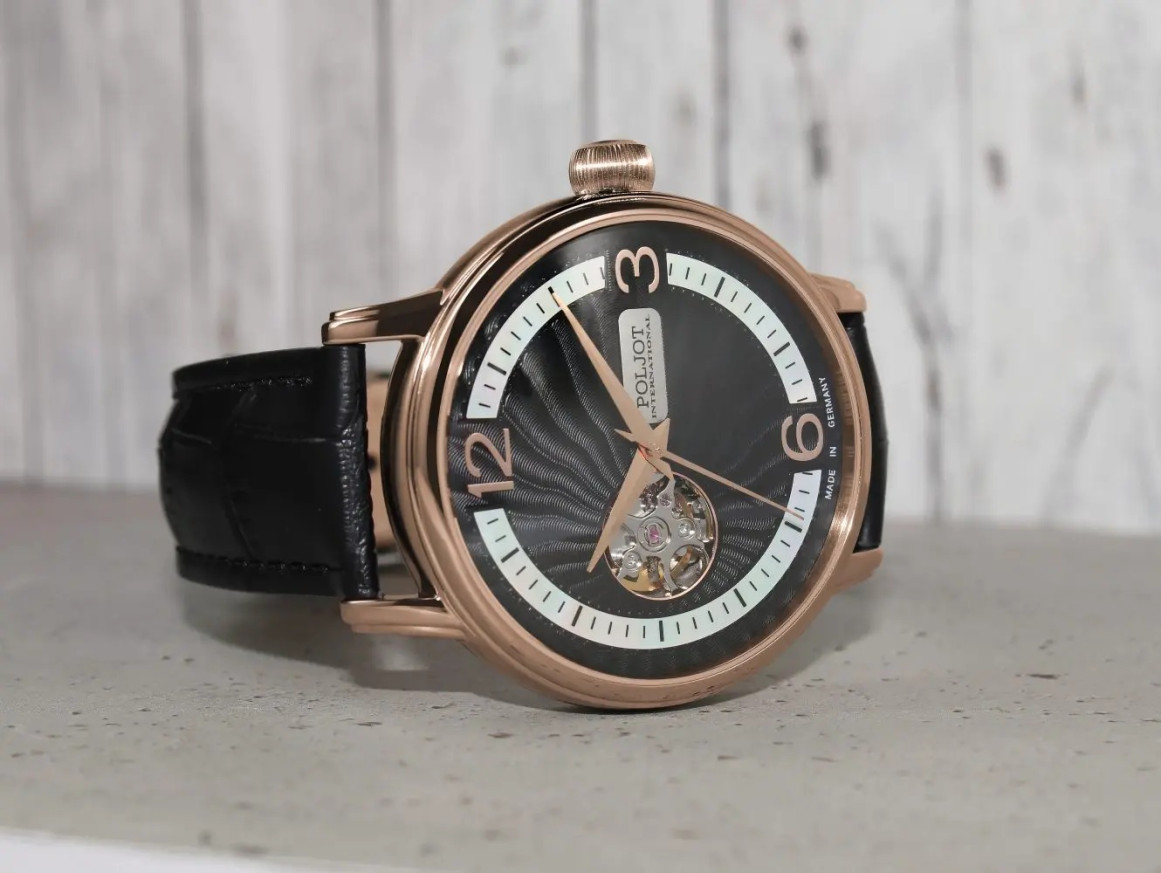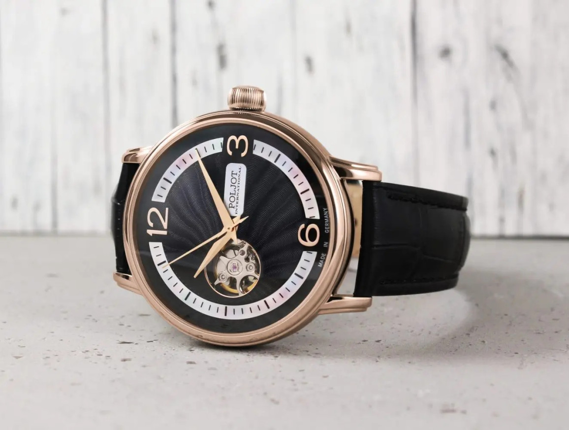 Часовник POLJOT INTERNATIONAL Jaros Open Heart 42mm Limited Edition 100pcs 38NH.4286813 представя изискан баланс между класическа елегантност и техническо съвършенство. Корпусът от розово позлатвна стомана, черният гулиоширан циферблат с отворено сърце (Open Heart) и розово-златните стрелки създават усещане за лукс и прецизност. Вътре работи надеждният автоматичен механизъм Seiko NH38. Ограничен до 100 броя, този модел е истинско бижу за ценители на традиционното часовникарско изкуство.