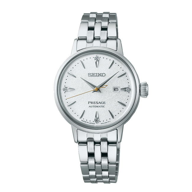 Часовник Seiko Presage SRE017J1 е елегантен дамски автоматичен модел от колекцията Presage Cocktail Time, вдъхновен от коктейла “Bellini”. Корпусът е с диаметър 29 мм, изработен от неръждаема стомана, а циферблатът е в меко розово-златисто със слънчев шлиф и деликатни индекси. Задвижван от механизъм 2R05 с 21 камъка, моделът предлага до 40 часа резерв на мощност. Hardlex стъкло, прозрачeн заден капак и водоустойчивост 50 м подчертават японската прецизност и женствената елегантност на този часовник.