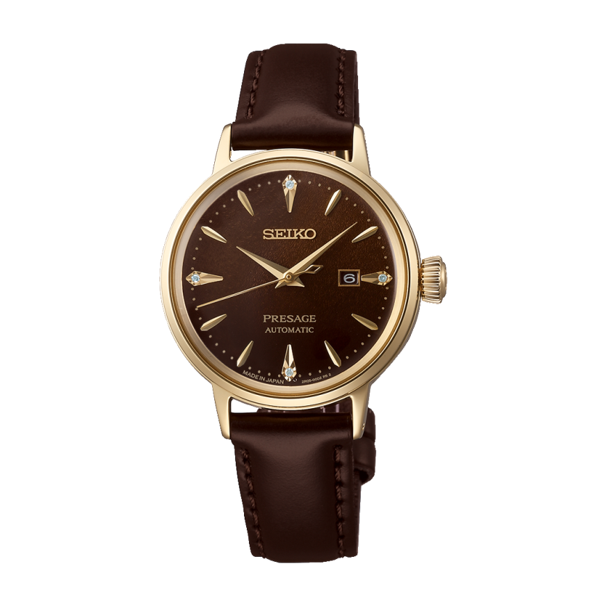 Часовник Seiko Presage SRE020J1 е изискан дамски автоматичен модел от серията Presage Cocktail Time, вдъхновен от коктейла “Skydiving”. Корпусът е с диаметър 29 мм, изработен от неръждаема стомана, а циферблатът е в нежен светлосин оттенък със слънчев шлиф и метални индекси. Задвижван от автоматичен механизъм 2R05 с 21 камъка, моделът предлага до 40 часа резерв. Hardlex стъкло, прозрачeн заден капак и водоустойчивост 50 м подчертават съвършенството и фината японска естетика.