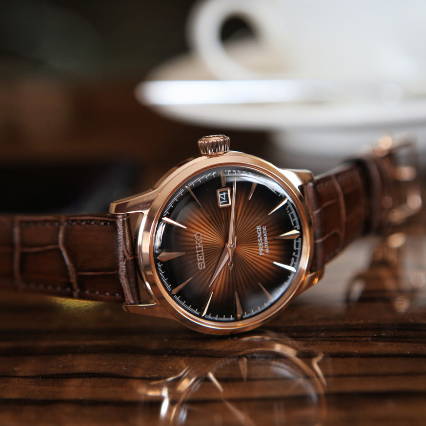 Часовник Seiko Presage SRPB46J1 е елегантен автоматичен мъжки модел с характерен кафяв „sunburst“ циферблат и корпус с розово златисто покритие. Вдъхновен от японската естетика и традицията на Presage, този часовник съчетава класически дизайн с надежден механичен автоматичен механизъм. Сапфиреното стъкло и кожената каишка подчертават луксозното излъчване, превръщайки модела в отличен избор за стилно ежедневие и официални поводи.