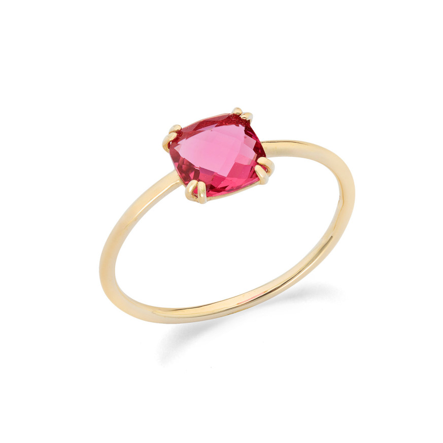 Пръстен с изискан и съвременен дизайн, изработен от жълто злато 375‰ с брилянтен фасетиран розов кристал, инкрустиран с четири зъбеца за подсилване на блясъка му. Тънката обковка прави този пръстен идеален за самостоятелно носене за елегантен вид или в комбинация с други пръстени за създаване на модерни и изискани комбинации. Произведен в Италия.