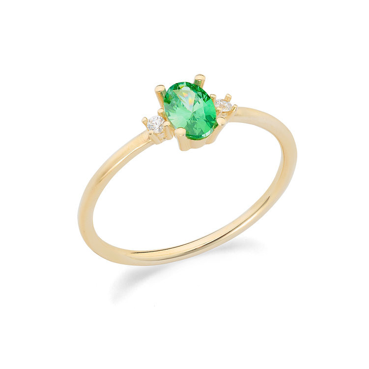 Изискан пръстен, изработен от жълто злато 375‰ със сияен централен камък с овален шлиф, инкрустиран с четири зъбца за подсилване на блясъка му. Отстрани два бели циркониеви камъка добавят нотка блясък и баланс към дизайна. Перфектен за тези, които обичат елегантни и универсални бижута, може да се носи самостоятелно за изискан вид или в комбинация с други пръстени за по-изтънчен ефект. Произведен в Италия