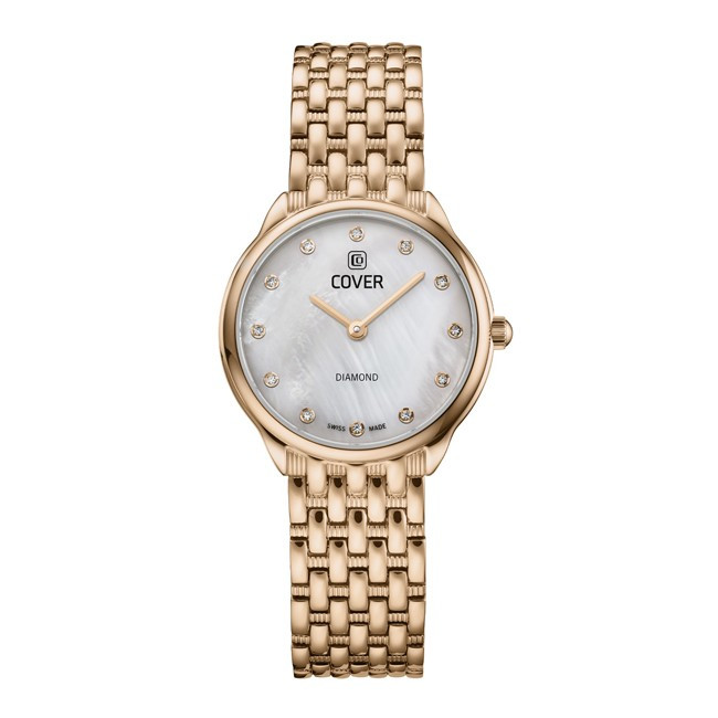Дамски Часовник Cover CO227.05 Cover CO227.05 от колекция Eternal Pearl e дамски швейцарски автоматичен часовник с бял циферблат с индекси с диаманти, стъкло сапфир кристал, розовозлатист корпус от неръждаема стомана  с диаметър 28 mm и розовозлатиста верижка, изработена от неръждаема стомана. Моделът е с 5 ATM водоустойчивост и механизъм Ronda 762 с функции Час, Минути. Всички часовници Cover са с 5 години гаранция.