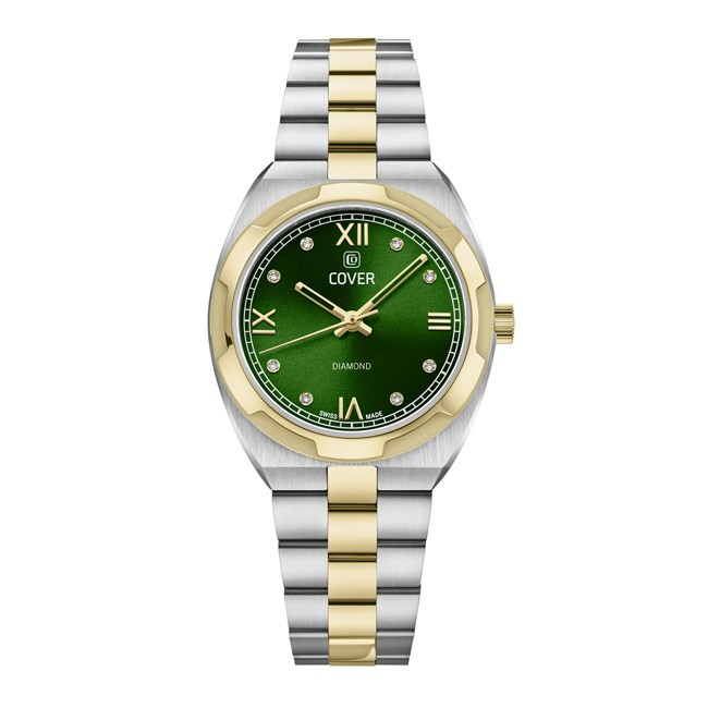 Дамски Часовник Cover CO228.05 Cover CO228.05 от колекция Urban Muse e дамски швейцарски автоматичен часовник със зелен циферблат с индекси с диаманти, стъкло сапфир кристал, двуцветен  корпус от неръждаема стомана  с диаметър 32 mm и двуцветна  верижка, изработена от неръждаема стомана. Моделът е с 5 ATM водоустойчивост и механизъм Ronda 763 с функции Час, Минути, Секунди. Всички часовници Cover са с 5 години гаранция.