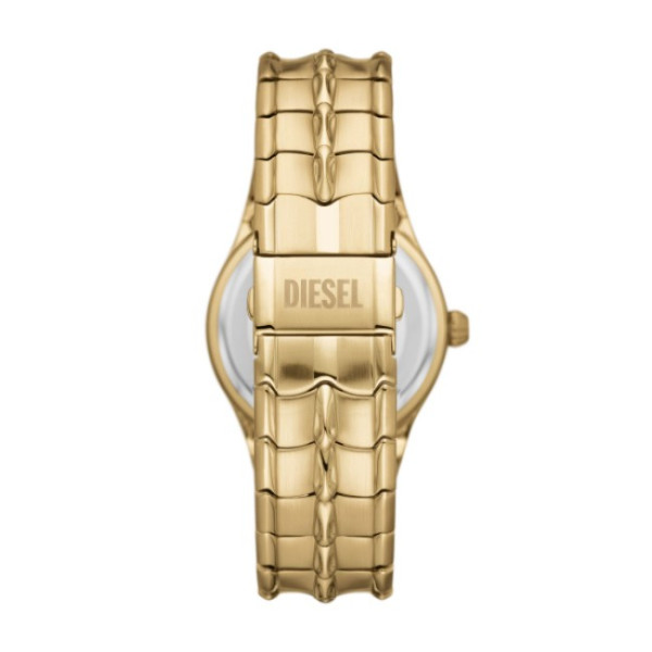 Часовник Diesel DZ2186 от серията Vert впечатлява с характерен златист вид: корпус Ø44 мм и верижка от благородна стомана с елегантен златист финиш. Циферблатът предлага златисто sunray покритие, трите стрелки и индикатор за дата, поддържан от кварцов механизъм. С двоен бутон fold‑over закопчалка, минерално стъкло и водоустойчивост 5 ATM (50 м), този модел съчетава стил и практичност.